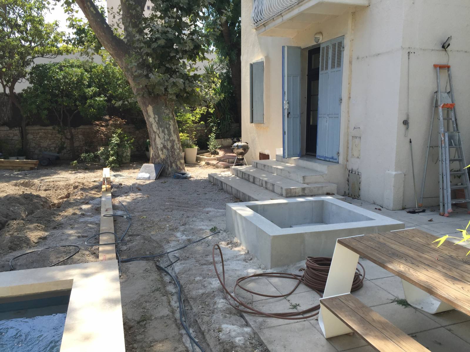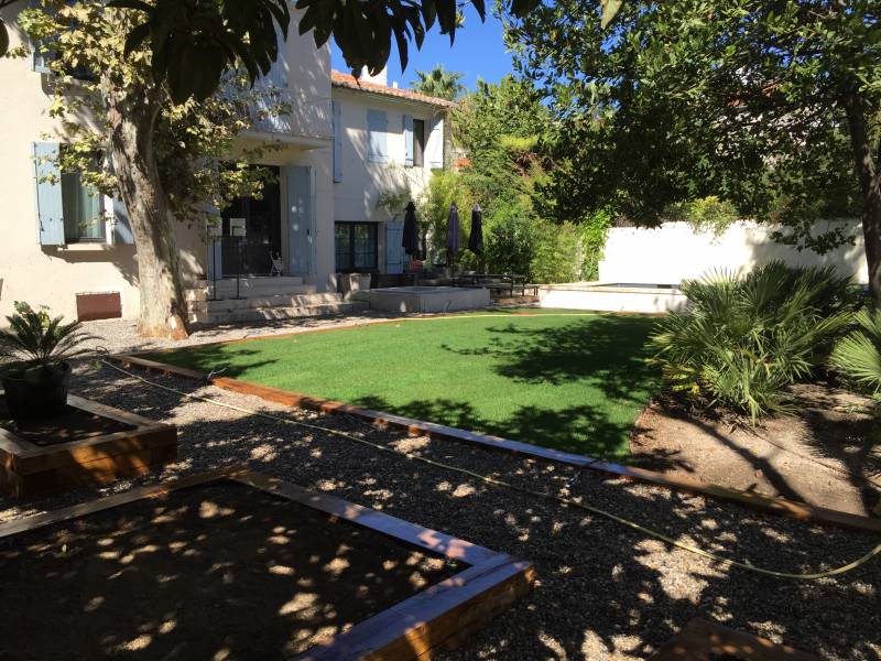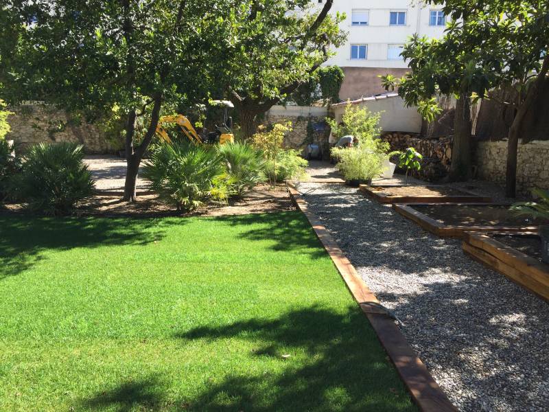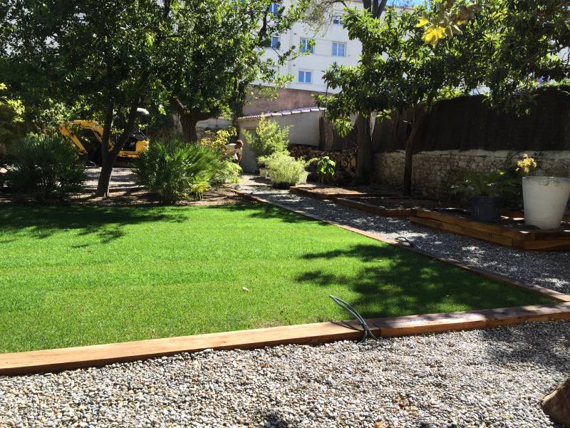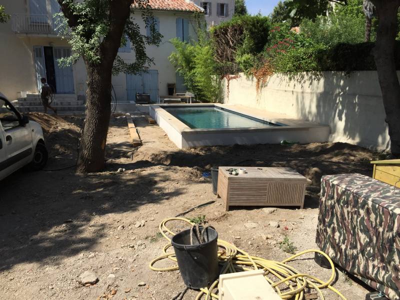 espace extérieur agrémenté d'une piscine. La société Vert Tige a trouvé un terrain nu qu'il a fallu dans un premier temps nettoyer et mettre au niveau. Suite à ce travail, le jardin a été borduré à l'aide de